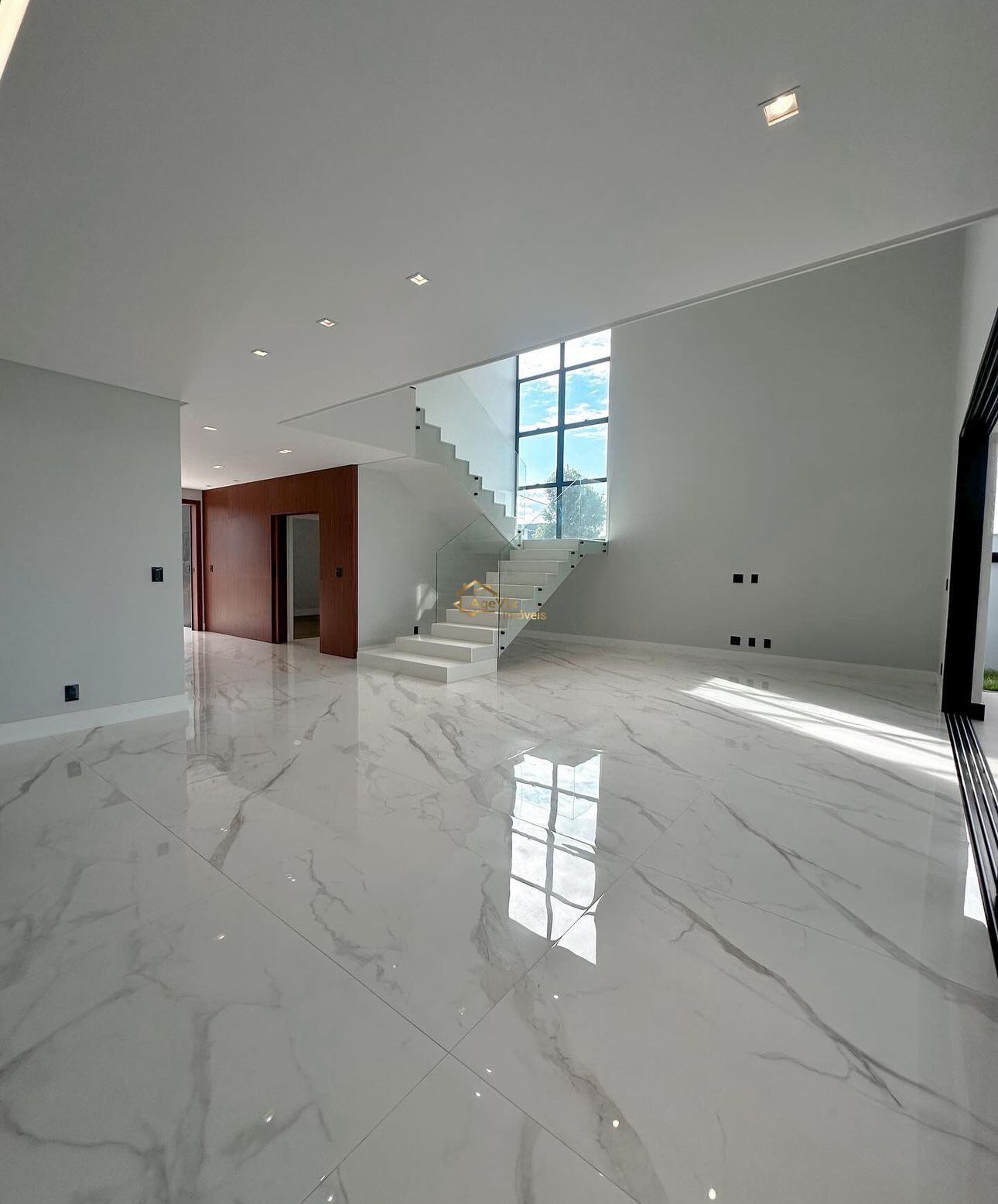 No primeiro pavimento, a ampla sala de TV e estar é um convite ao relaxamento, perfeitamente integrada a uma cozinha de conceito aberto com uma ilha central em Quartzito Adamantium, ideal para momentos especiais em família ou entre amigos.